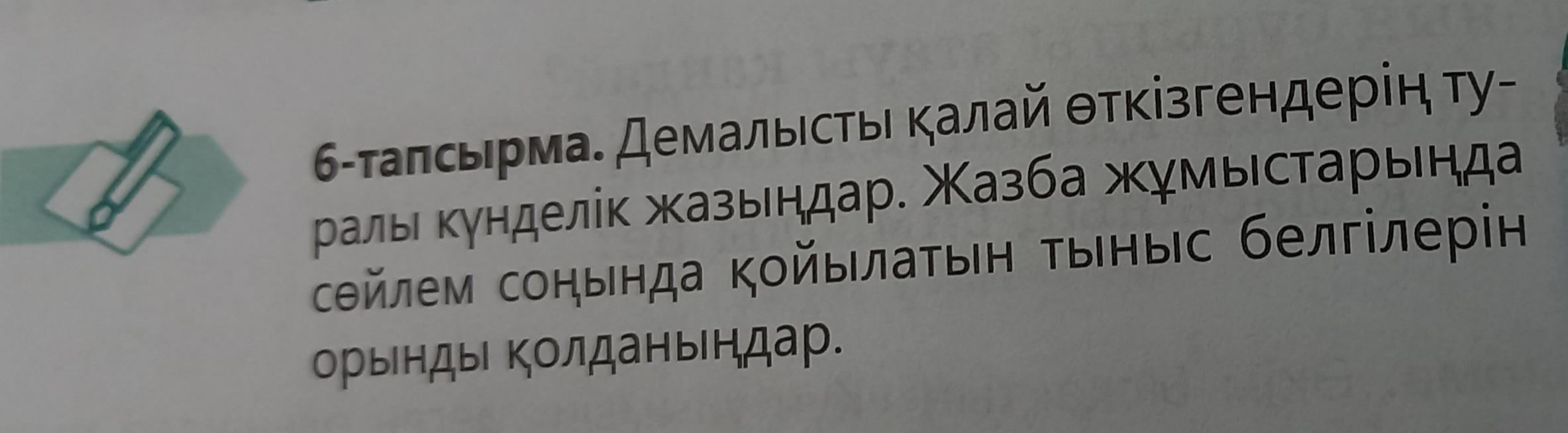 Жазғы демалыста бостан-бос үйде отырмай, оны пайдалы өткіземін деп шештім. Жалпы өзім таза ауада серуендегенді ұнатамын. Таңертең ұйқыдан оянған соң, далаға шығып жүгіріп отырдым. Осының арқасында, өзімнің физикалық даярлығымды қалыпқа келтіре алдым. Компьютердің, телефонның немесе теледидардың алдында уақытымды өткізген жоқпын. Үйде ата-анама көмектесіп, олардың тапсырмаларын мұқият орындап отырдым. Шілде айында отбасыммен бірге көлге бардық. Бұған дейін мен мұндай курорттарда болған емеспін. Осы сапар маған тек жағымды эмоциялар ғана сыйлады. Жаздың ыстық күндерінде суға шомылып, құмды жағажайда жату керемет екен. Ата-анаммен аквапаркке барып, өмірінде алғаш рет дельфиндерді көрдім. Катамаранға және қайыққа мініп, көлде жүзідік. Ал, кеш батқан кезде, уақытымызды жағалауда серуендеумен өткіздік. Бұл демалыс, маған ұмытылмас әсер қалдырды! Келесі жылы осы жерге қайтадан келуді жоспарлап отырмыз. Тамыз айында қалада болдым. Менің әкем балық аулауды қатты ұнатады. Ол осы жолы жанына мені ертіп алуға шешім қабылдады. Қолымызға қармағымызды алып, өзенге аттандық. Жолым болып, судан бірнеше рет үлкен балық алып шықтым. Үйге келген соң, анам осы балықтан өте дәмді тамақ әзірледі. Соңғы аптада жаңа оқу жылына дайындала бастадым. Жазғы каникул ең ұзақ болғанымен, өте жылдам өтіп кетеді.