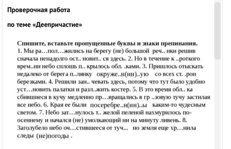 1. Мы расположились на берегу небольшой речонки, решив сначала ненадолго остановиться здесь. 2. Но в течении короткого времени небо сплошь покрылось облаками. 3. Пришлось отыскать недалеко от берега полянку окружённую со всех сторон берёзками. 4. Решили заночевать здесь, потому что тут было удобно установить палатки и разложить костёр. 5. В это время облака сбившиеся в кучу медленно превращались в грозовую тучу, застилая всё небо. 6. Края её были посеребрены каким-то чудесным светом. 7. Небо затянулось тяжёлой пеленой нахмурилось по-осеннему и начался неумолкающий ни на минуту ливень. 8. Заголубело небо очистившееся от туч, но земля ещё хранила следы непогоды.