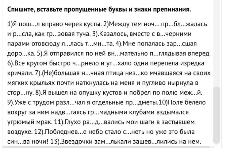Ответ: Мы расположились на берегу небольшой речонки, решив сначала ненадолго остановиться здесь. Но в течение короткого времени небо сплошь покрылось облаками. Пришлось отыскать недалеко от берега в лесу полянку, окруженную со всех сторон березками. Решили заночевать здесь, потому что тут было удобно установить палатки и разложить костер. Между тем облака, сбившиеся в кучу, медленно превращались в грозовую тучу, застилавшую все небо. Края ее были как будто посеребрены каким-то чудесным светом. Небо затянулось тяжелой пеленой, нахмурилось по-осеннему, и начался не умолкающий ни на минуту ливень. Лишь к утру он прекратился. Заголубело небо, очистившееся от туч, но земля еще хранила следы непогоды. Справа и слева от палаток, переливаясь в лучах солнца, блестели лужицы.