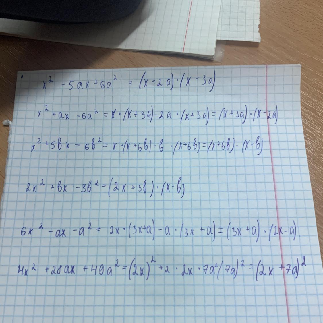 х^2-5ax+6a^2=x^2-2ax-3ax+6a^2=x(x-2a) -3a(x-2a)=(x-2a)(x-3a)