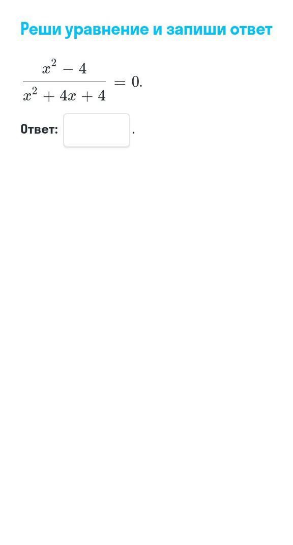 \displaystyle \frac{x^2-4}{x^2+4x+4}=0,x\neq -2\\\\ \frac{(x-2)(x+2)}{(x+2)^2}=0\\\\ \frac{x-2}{x+2}=0\\\\ x-2=0\\x=2