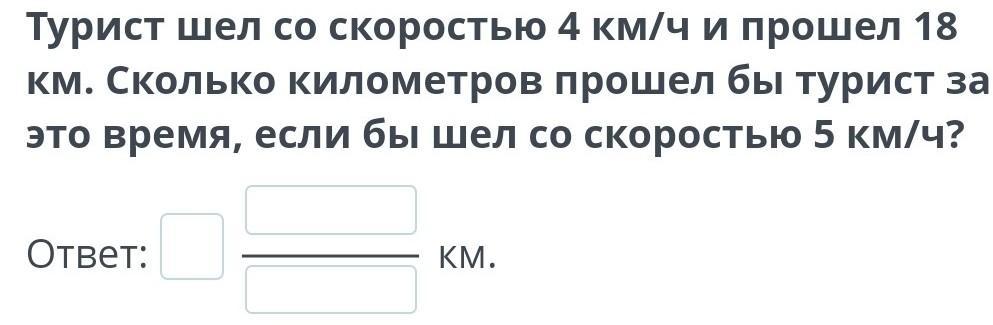 Турист шел со скоростью 4 км/ч и прошел 18 км. Сколько километров прошел бы турист за это время, если бы шел со скоростью 5 км/ч