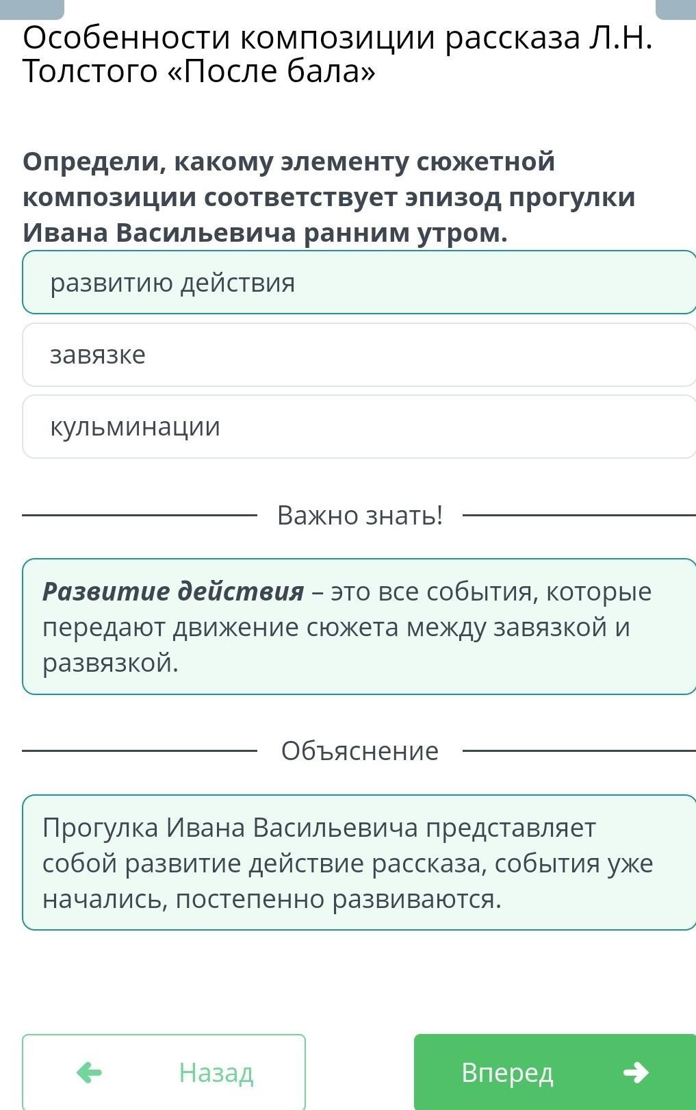 Особенности композиции рассказа Л.Н. Толстого «После бала» Определи, какому элементу сюжетной композиции соответствует эпизод прогулки Ивана Васильевича ранним утром.
