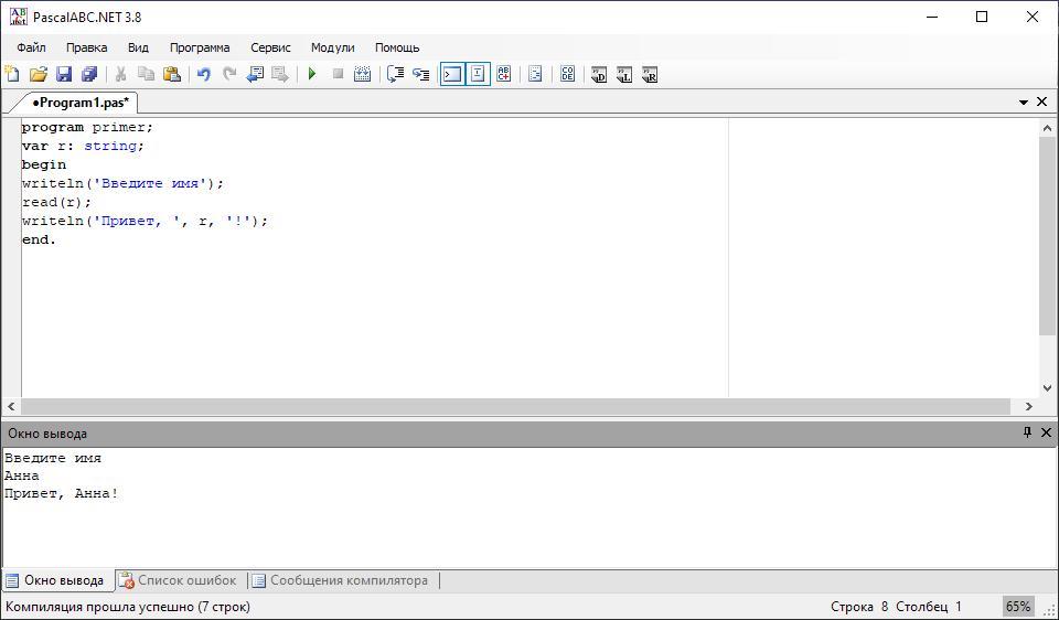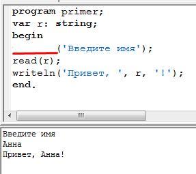 Текст после "Введите имя" должен вводиться с новой строчки, а, соответственно, оператор вывода write не подходит. Нужен writeln.