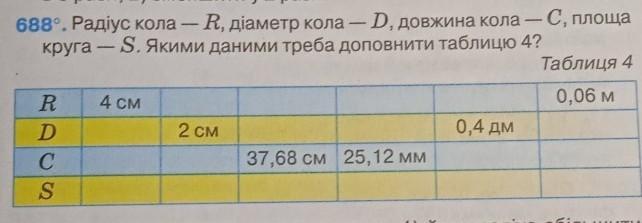 - 688°. Радіус кола — R, діаметр кола — D, довжина кола — С, площа круга — S. Якими даними треба доповнити таблицю 4? Таблиця 4 R 0,06 м D 0,4 дм с 37,68 см 25,12 мм s 4 см 2 см
