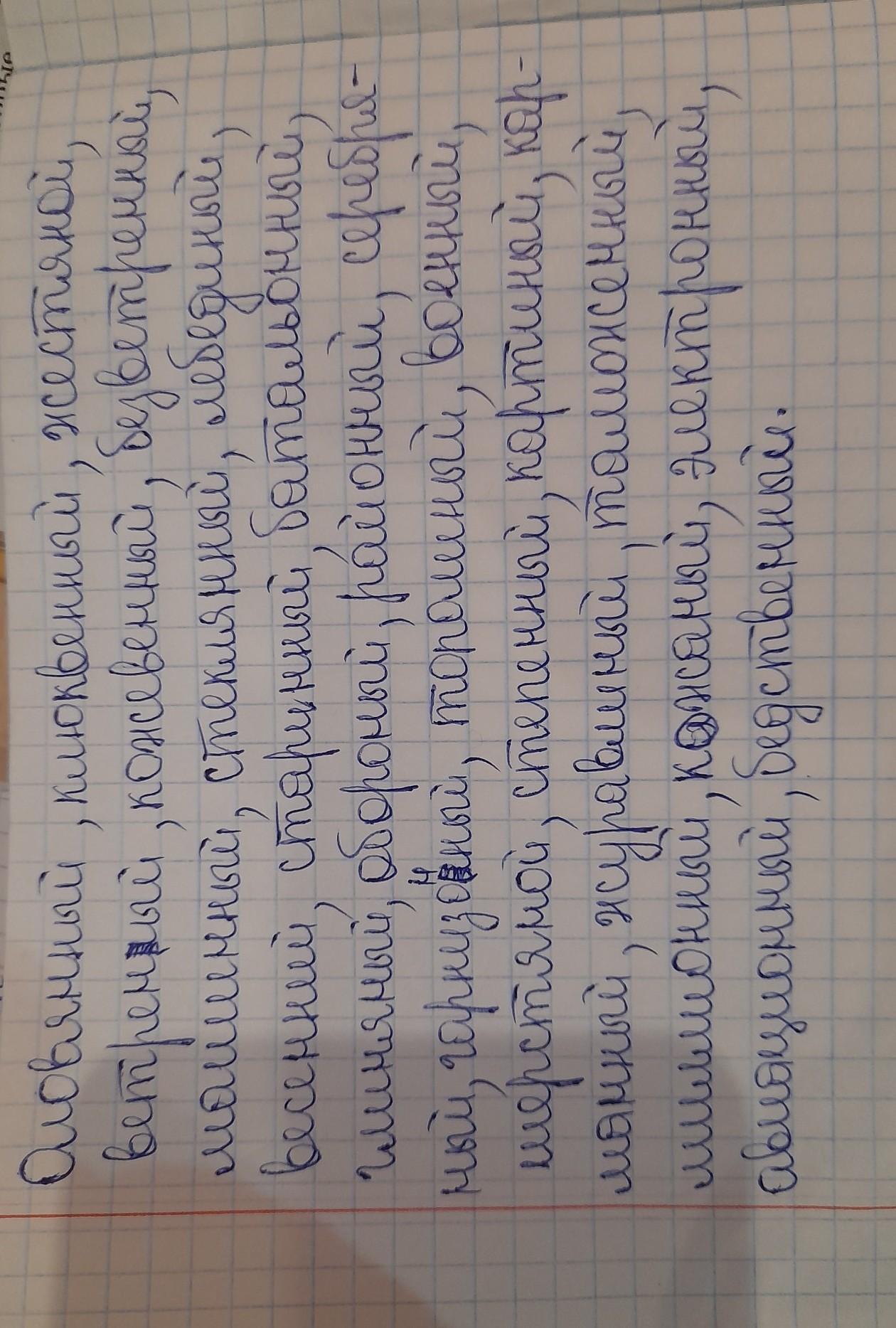 4 Оловян ый, клюквен ый, жестян ой, ветреи ый, кожевен ый, безветрен ый, машин ый, стеклян ый, лебедин ый, весен ий, ста- рин ый, батальон ый, глинян ый, оборон ый, район мй, сереб- рян ый, гарнизон ый, тополин ый, воен ый, шерстян ой, сте- пен ый, картин ый, карман ый, журавлин ый, таможен ый, миллион ый, кожан ый, электрон ый, авиацион ый, бедствен ый.