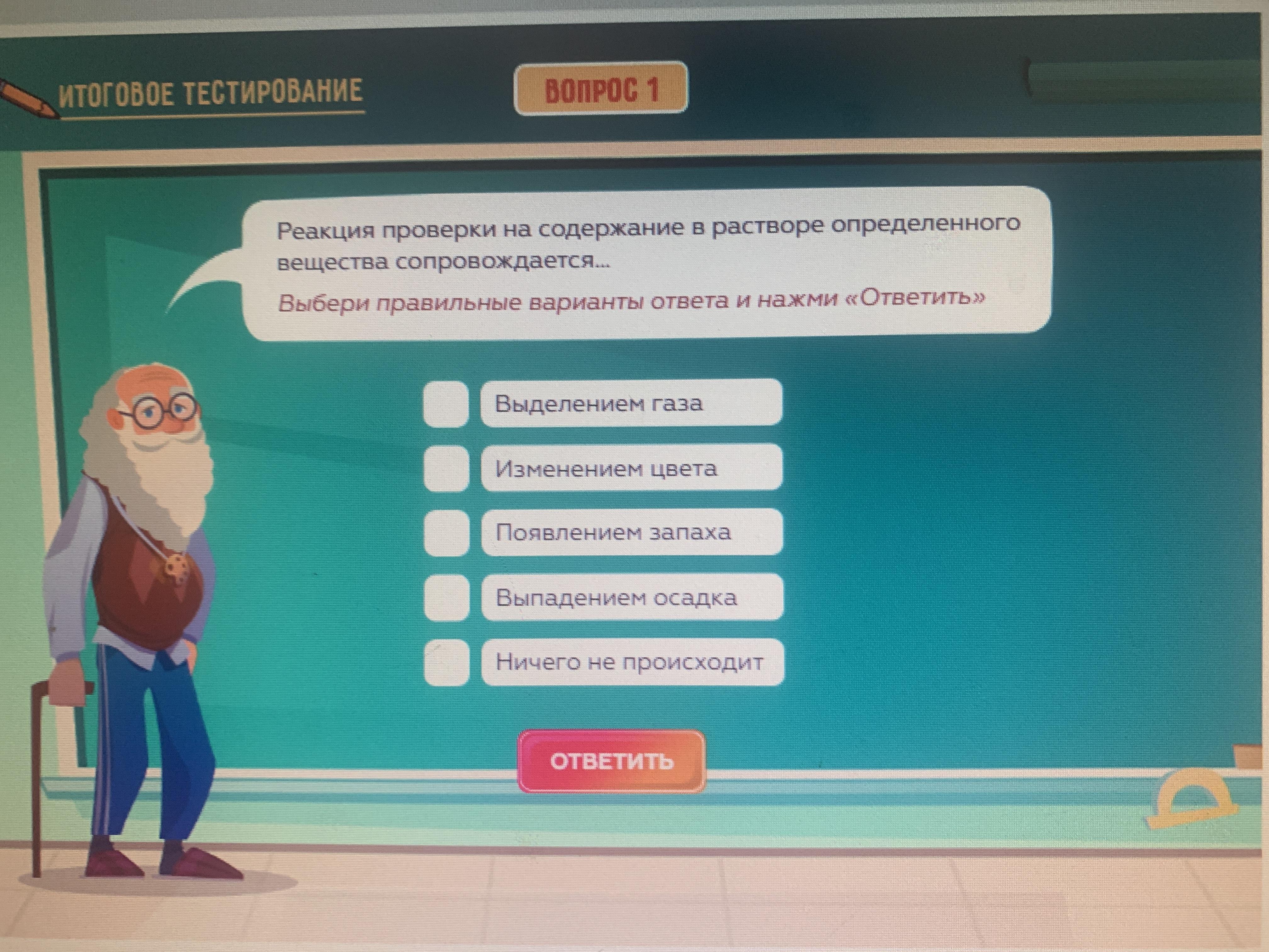 Реакция проверки на содержание в растворе определённого вещества сопровождается 1) Выделением газа 2)изменением цвета 3)появлением запаха 4)выпадение осадка 5)ничего не происходит