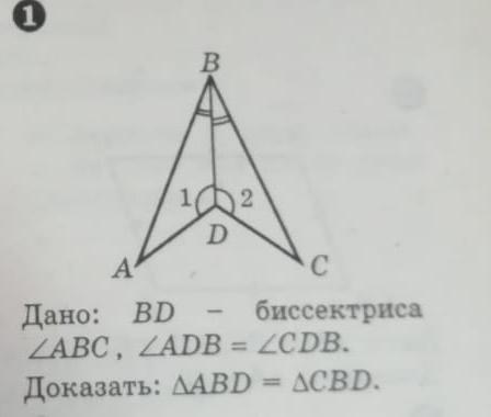угол 1 = углу 2, А=С, ВД - биссектриса (условие). АВД = СВД по двум сторонам и углу между ними (признак 1)