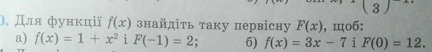 \displaystyle\bf\\1)\\\\f(x)=1+x^{2} \\\\F(x)=x+\frac{x^{3} }{3} +C\\\\F(-1)=2\\\\2=-1+\frac{(-1)^{3} }{3} +C\\\\\\C=2+1+\frac{1}{3} =3\frac{1}{3} \\\\\\\boxed{F(x)=x+\frac{x^{3} }{3} +3\frac{1}{3}}\\\\\\2)\\\\f(x)=3x-7\\\\\\F(x)=3\cdot\frac{x^{2} }{2}-7x+C\\\\\\F(x)=1,5x^{2}  -7x+C\\\\\\F(0)=12\\\\\\12=1,5\cdot 0^{2} -7\cdot 0+C\\\\\\C=12\\\\\\\boxed{F(x)=1,5x^{2} -7x+12}