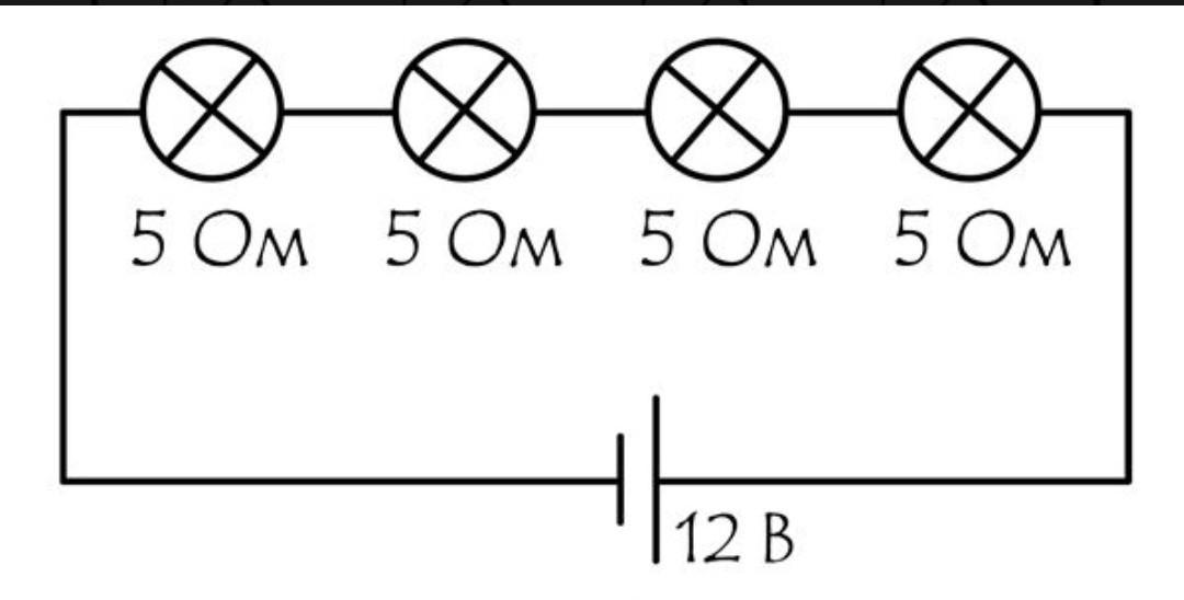 2) Сопротивление каждого из четырех потребителей тока (ламп) равно 5 Ом. Каково общее сопротивление данной электрической цепи?