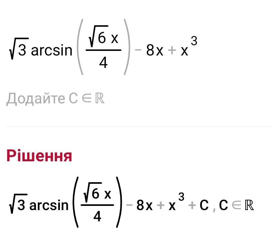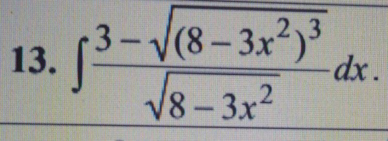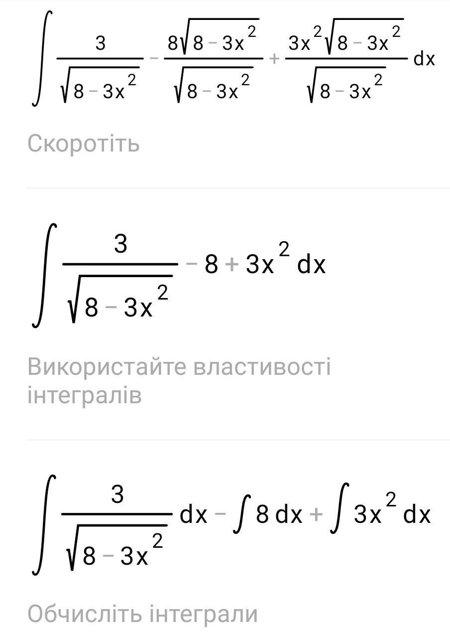Тут надо бить на сумму 2-x интегралов: первый это -|8-3x^2|dx; второй 3dx/sqrt(8-3x^2) - тут представляем так: -sqrt(3)*sqrt(3/8) *dx/sqrt(1-(sqrt(3/8) * x)^2) - понятно, что результат интегрирования прост: sqrt(3)*arcsin(sqrt(3/8) *x)