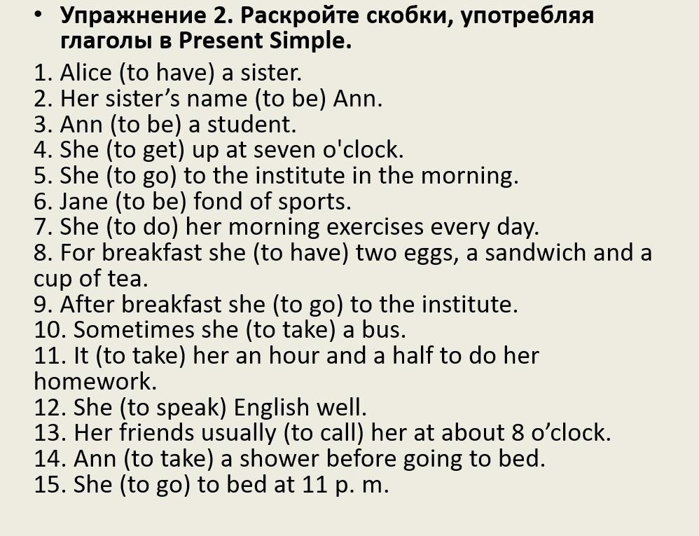 8. For breakfast she has two eggs, a sandwich and a cup of tea.