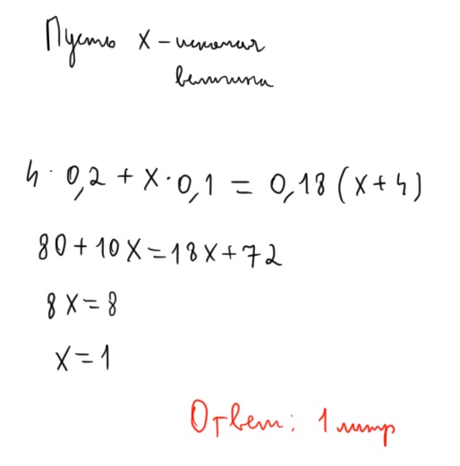 Чтобы получить 18% раствор соли из 4л 20% раствора, к нему 10% раствора нужно долить в количестве?