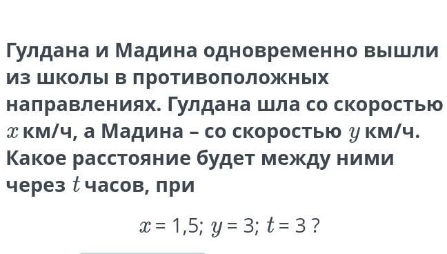 Гулдана и Мадина одновременно вышли из школы в противоположных направлениях. Гулдана шла со скоростью х км/ч, а Мадина - со скоростью у км/ч. Какое расстояние будет между ними через т часов, при x = 1,5; y = 3; t = 3 ?