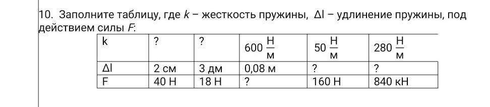 . Заполните таблицу, где k – жесткость пружины, – удлинение пружины, под действием силы F: