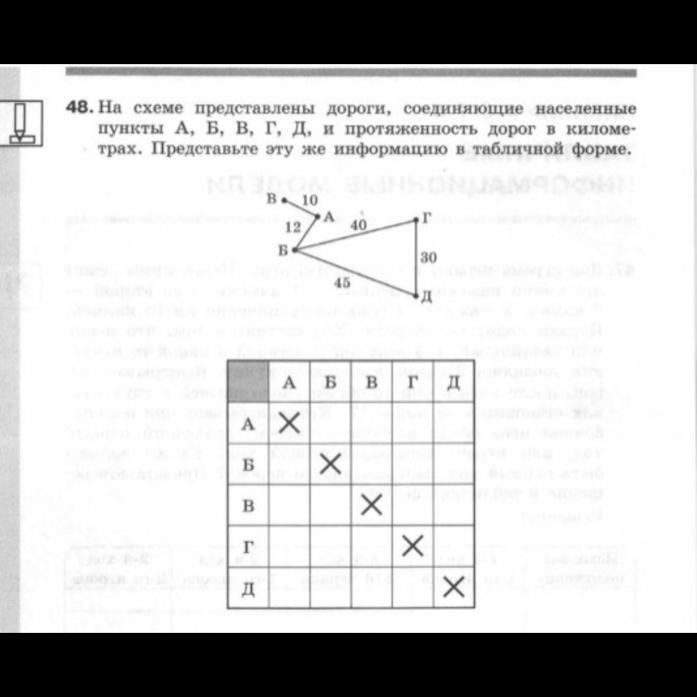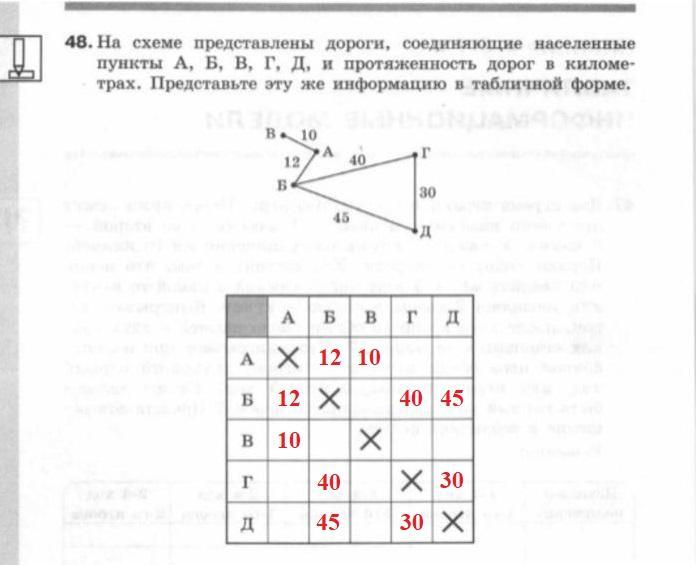 Если пункты на чертеже не соединены дорогами, то клетки таблицы на пересечении этих строк и столбцов остаются пустыми