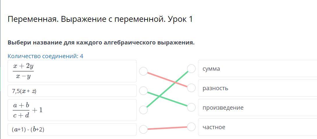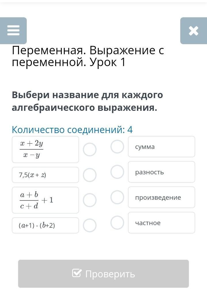 Переменная. Выражение с переменной. Урок 1 Выбери название для каждого алгебраического выражения. Количество соединений: 4 7,5(x + z) (a+1) - (b+2) сумма разность произведение частное Назад Проверить