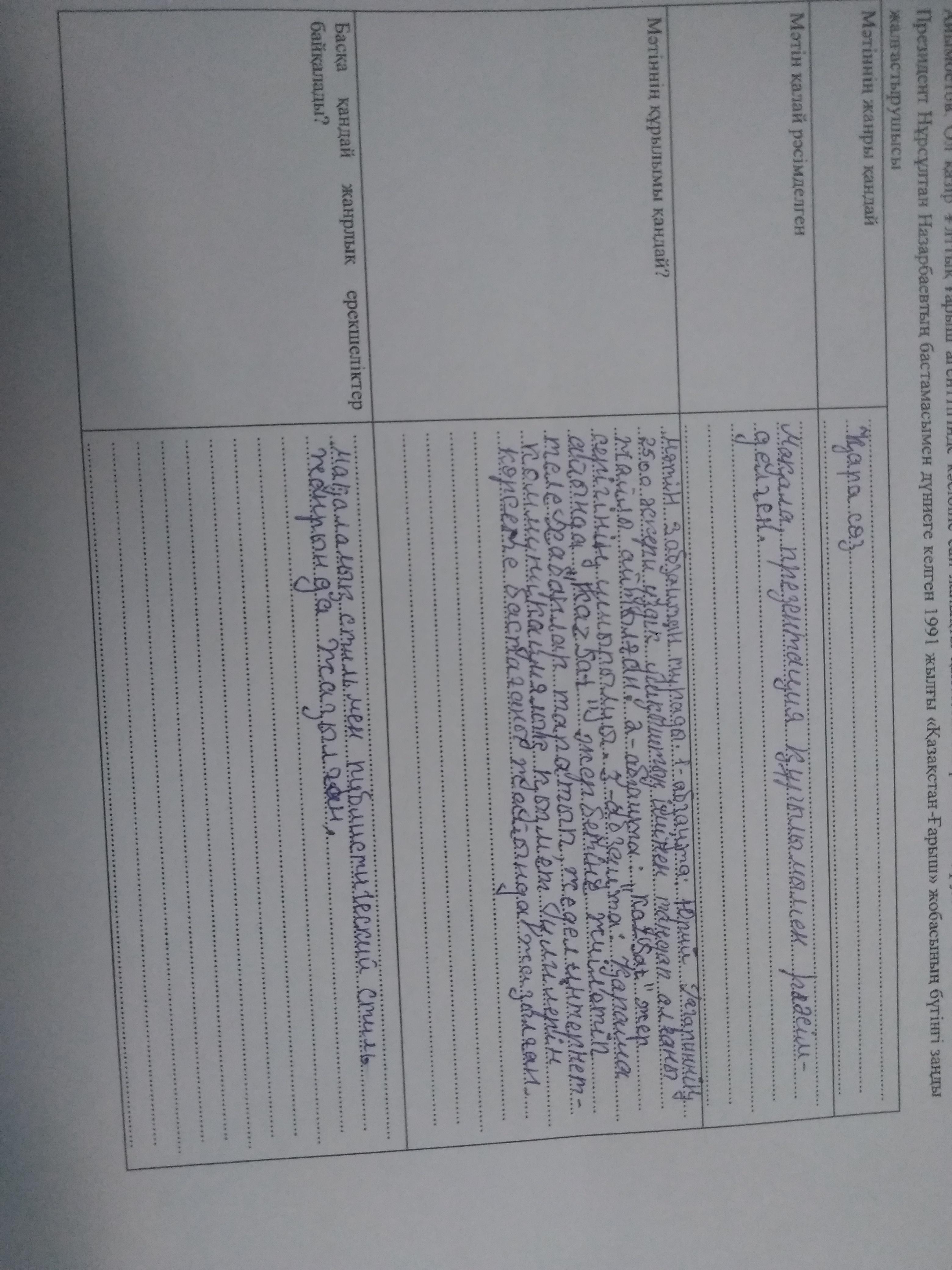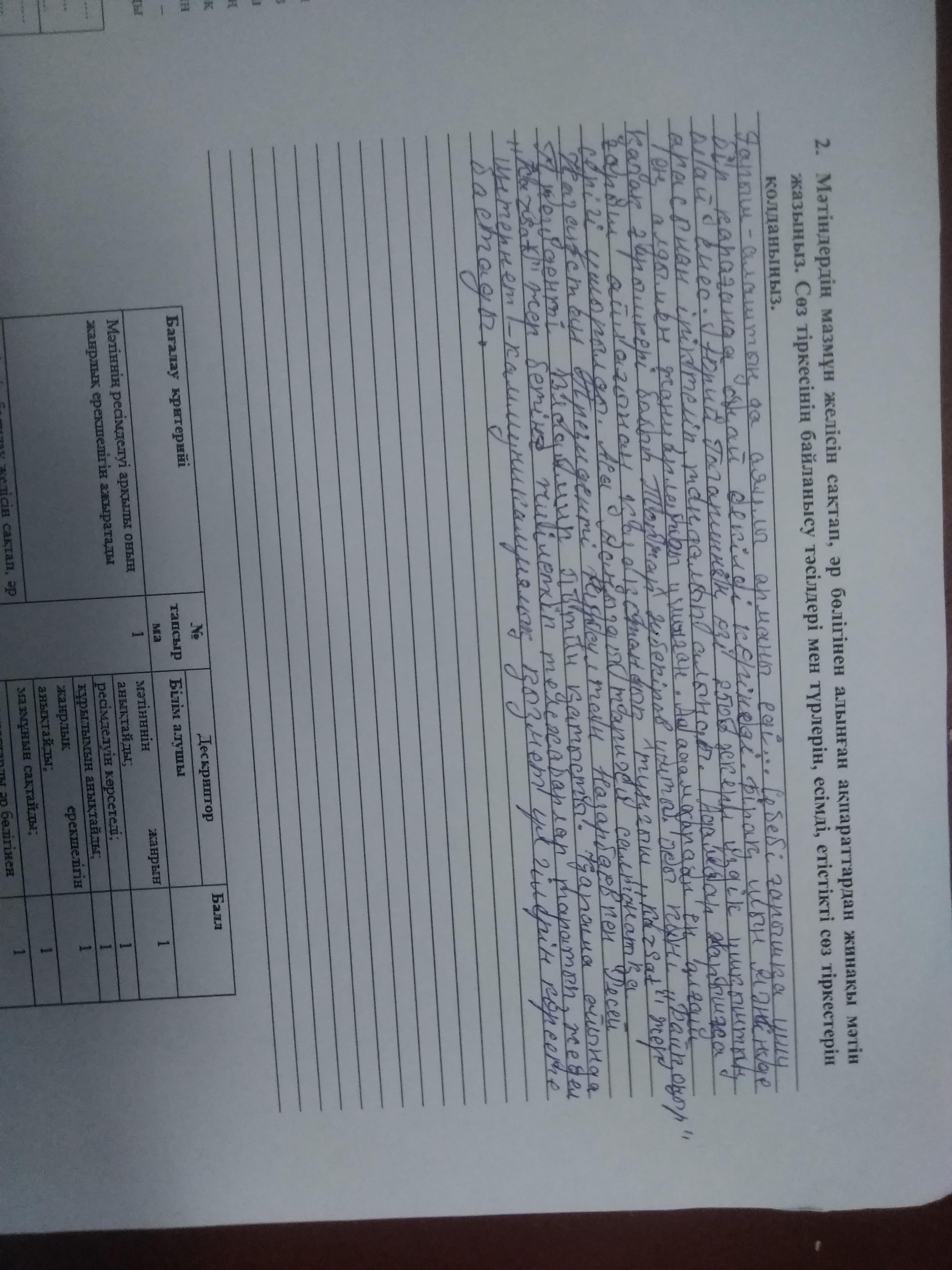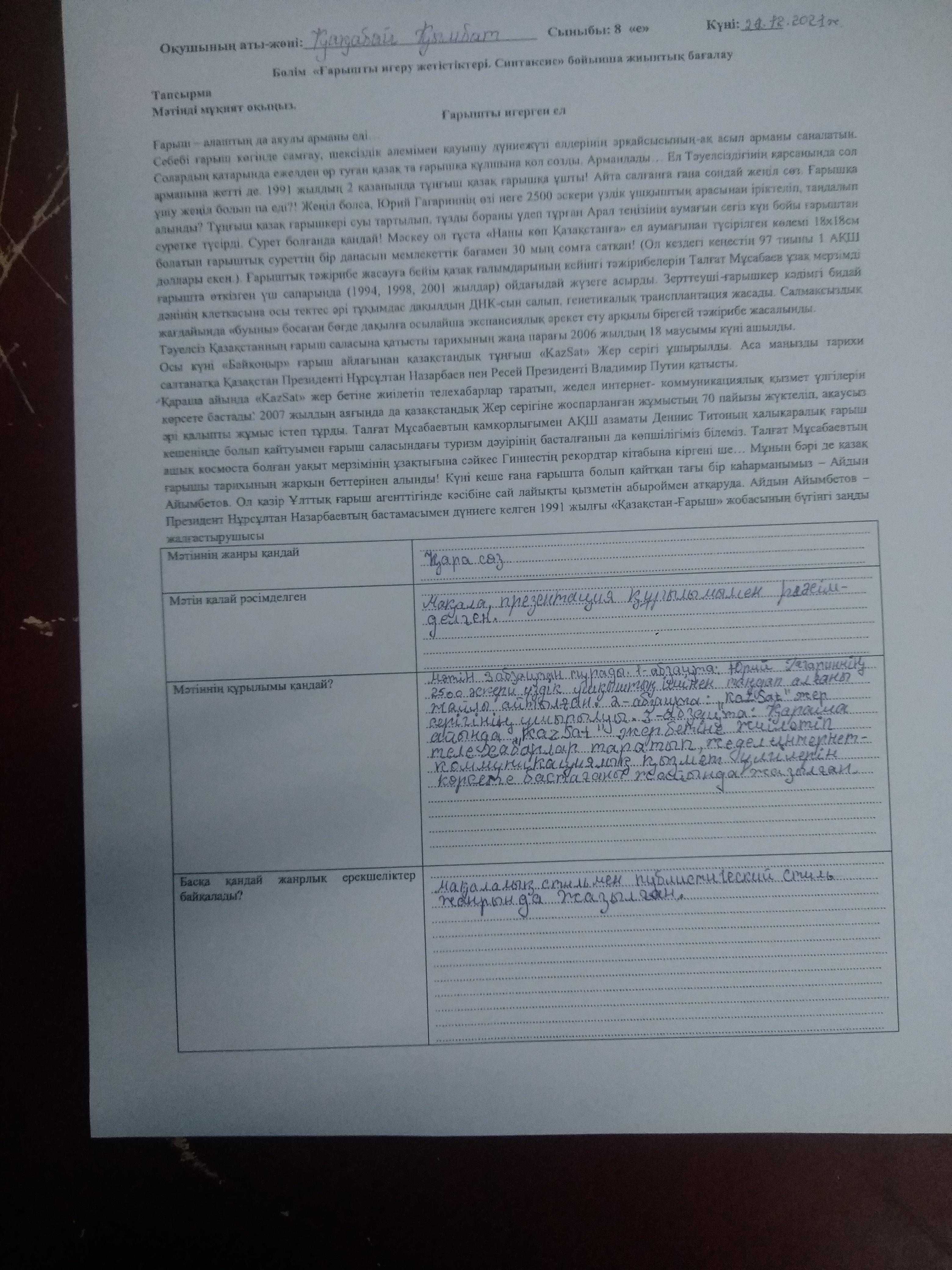 Қазақ тілі 8- сынып Бөлім «Ғарышты игеру жетістіктері. Синтаксис» Оқу мақсаты 8.2.3.1 мақала, презентация құрылымы мен ресімделуі арқылы жанрлық ерекшеліктерін ажырату 8.3.5.1 оқылым және тыңдалым материалдары бойынша, мәтіннің баяндау желісін сақтап, әр бөлігінен алынған ақпараттардан жинақы мәтін (аннотация, тезис) жазу Бағалау критерийі Білім алушы Мақаланың жанрлық ерекшеліктерін ажыратады Мәтін желісі бойынша аннотация жазады Ойлау дағдыларының Жоғары ойлау дағдылары деңгейі Орындау уақыты 15-20 минут Тапсырма 1 1. Көркем-пулицистикалық мақаланы оқып, жанрға тән кем дегенде үш ерекшелікті көрсетіңіз. Ерекшеліктер: 1 2 3 Ғарышқа саяхат арыш әлемі кең байтақ! Оны адамзат әлі толығымен зерттеп болған жоқ. Ғарыштың әлі де , ашылмагае сырлары қызықты.Ерте кезден-ақ грек ғалымдары ғарыш туралы түрлі болжамдар жасаған. Олардың ғарышқа саяхат жасағысы келгендерін осыдай байқауға болады. Ең алғаш ғарышкы саяхатты 1969 жылы ағылшындар бастаған болатын. Міне, содан бері гарын кеңістігі ғалымдармен игеріліп келедіүБіздің елемiзде «Байқоңыр» ғарыш станциясы бар. Мен оны Қазақстанды ғарыш әлемімен байланыстыратын көпір санаймын. Өйткені, барлық зымыран ұшақтар осы жерде саяхатының бастауын алады. Тоқтар Әубәкіров, Талғат Мұсабаев-осы адамдар Қазақстаннан ең алғаш ғарыш есігін ашқан ұшқыштар.Біз осы екі ержүрек тұлғаларымыздың арқасында ғарыш туралы түсінігімізді арттырдық. Ғарыш кеңістігінде 9 ғаламшар бар. «Жер » планетасы үшінші орында тұр.Біздің планетамыз тоғыз ғаламшардың ішіндегі өмірқолайлы ау қабаттары бар галамшар. Бірақ, менің ойымша, тіршілікке қолйлы басқа ғаламшарлар да бар. Неге десеңіз,өзге планеталықтар туралы қауесеттер көп тараған. Сонымен қоса, олардың адам баласымен байланыстары болғанын да айтқан.Егер өзге планеталықтар бар болса, олар да басқа планетада өмір сүріп жатуы әбден мүмкін. Дегенмен,ғарыш әлемі алдамшы. Адамның қарапайым көзімен қараған кезде басқа, ал ғылыми тұрғыдан қарағанда мүлдем басқаша. Күн-ғарыштың жүрегі. Соның ішінде біздің планетамыздың жылу көзі. Әр адам ғарышқа саяхаттағысы келеді. Әр адам ұшқыш болғысы келеді. Бірақ ол үшін адам баласына шыдамдылық пен ақылдылық,ғарыш туралы көп мәліметтер керек. Осымен менің ғарышқа саяхатым аяқталды.. Тапсырма 2. Мақаланы оқуға қалың көпшіліктің қызығушылығын тударатындай 50-6 Се?ден тұратын аннотация жазыңыз. Аннотацияны жазуда төмендегі КЛИшелер