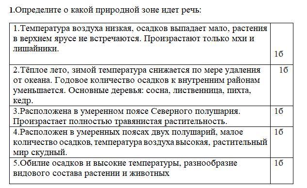 4.Расположен в умеренных поясах двух полушарий, малое количество осадков, температура воздуха высокая, растительный мир скудный. 1б