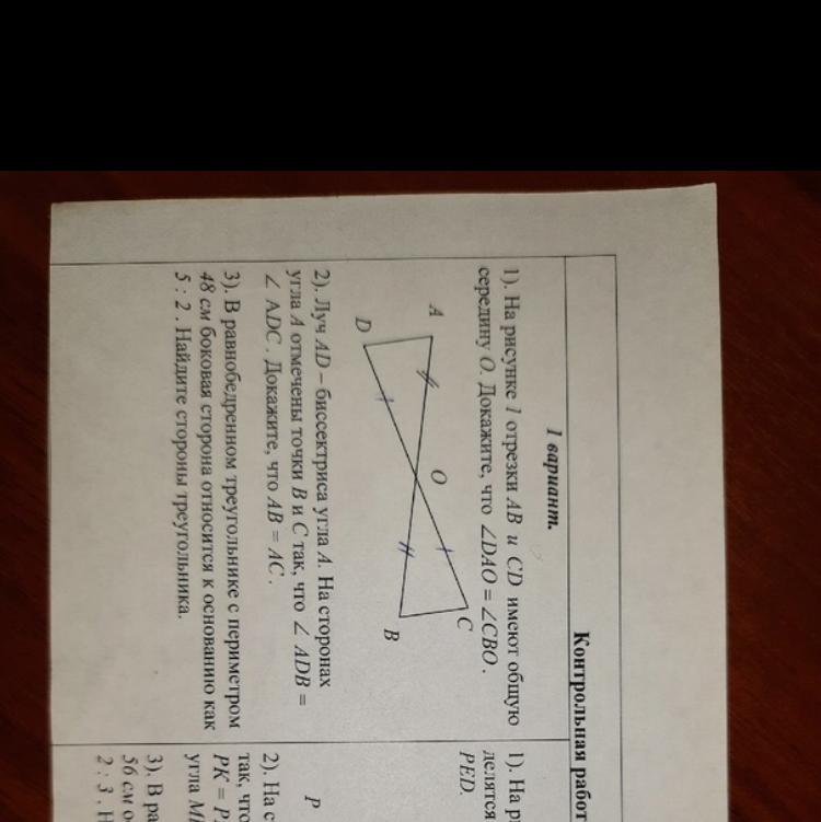 Доказательство: 1. AD (общая сторона). 2. ∠BAD = ∠CAD(по условию). 3. ∠BDA = ∠CDA(по условию) ⇒ ▲ABD = ▲ACD(по УСУ) ⇒ AD = AC(как соответственные).