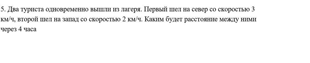 Два туриста одновременно вышли из лагеря. Первый шел на север со скоростью 3 км/ч, второй шел на запад со скоростью 2 км/ч. Каким будет расстояние между ними через 4 часа