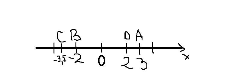 начертите кординатную прямую с единичным отрезком 2 клетки и отметьте на ней точки:А(3)В(-2)С(-3,5)Д(2). Запишите точки с противоположными кординатами