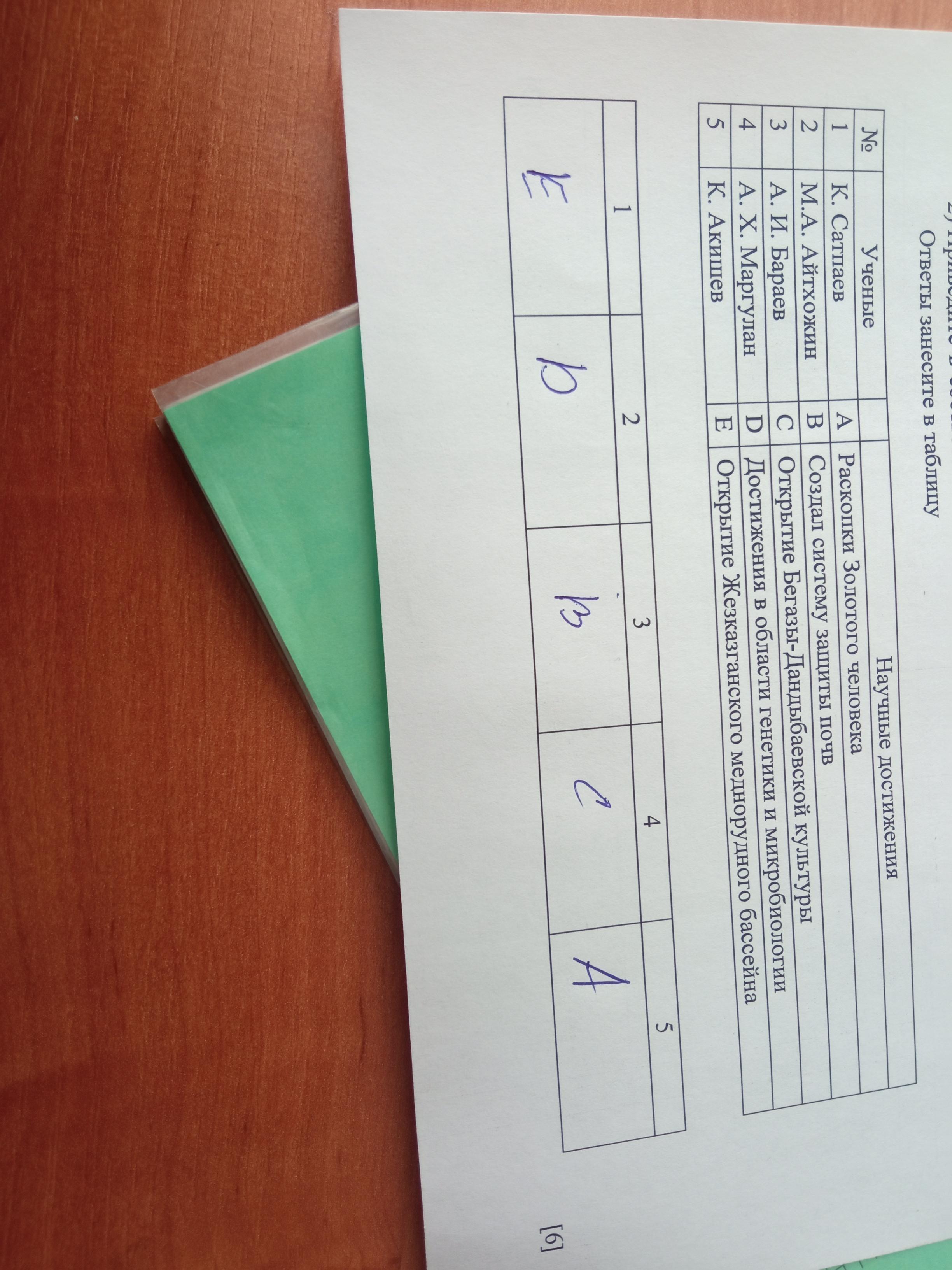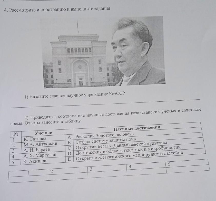 4. Рассмотрите иллюстрацию и выполните задания ВА 1) Назовите главное научное учреждение КазССР 2) Приведите в соответствие научные достижения казахстанских ученых в советское время. Ответы занесите в таблицу No 1 2 3 4 5 Ученые К. Сатпаев М.А. Айтхожин А. И. Бараев А. Х. Маргулан К. Акишев Научные достижения A Раскопки Золотого человека B Создал систему защиты почв СОткрытие Бегазы-Дандыбаевской культуры D Достижения в области генетики и микробиологии E Открытие Жезказганского меднорудного бассейна 5 3 4. 1 2