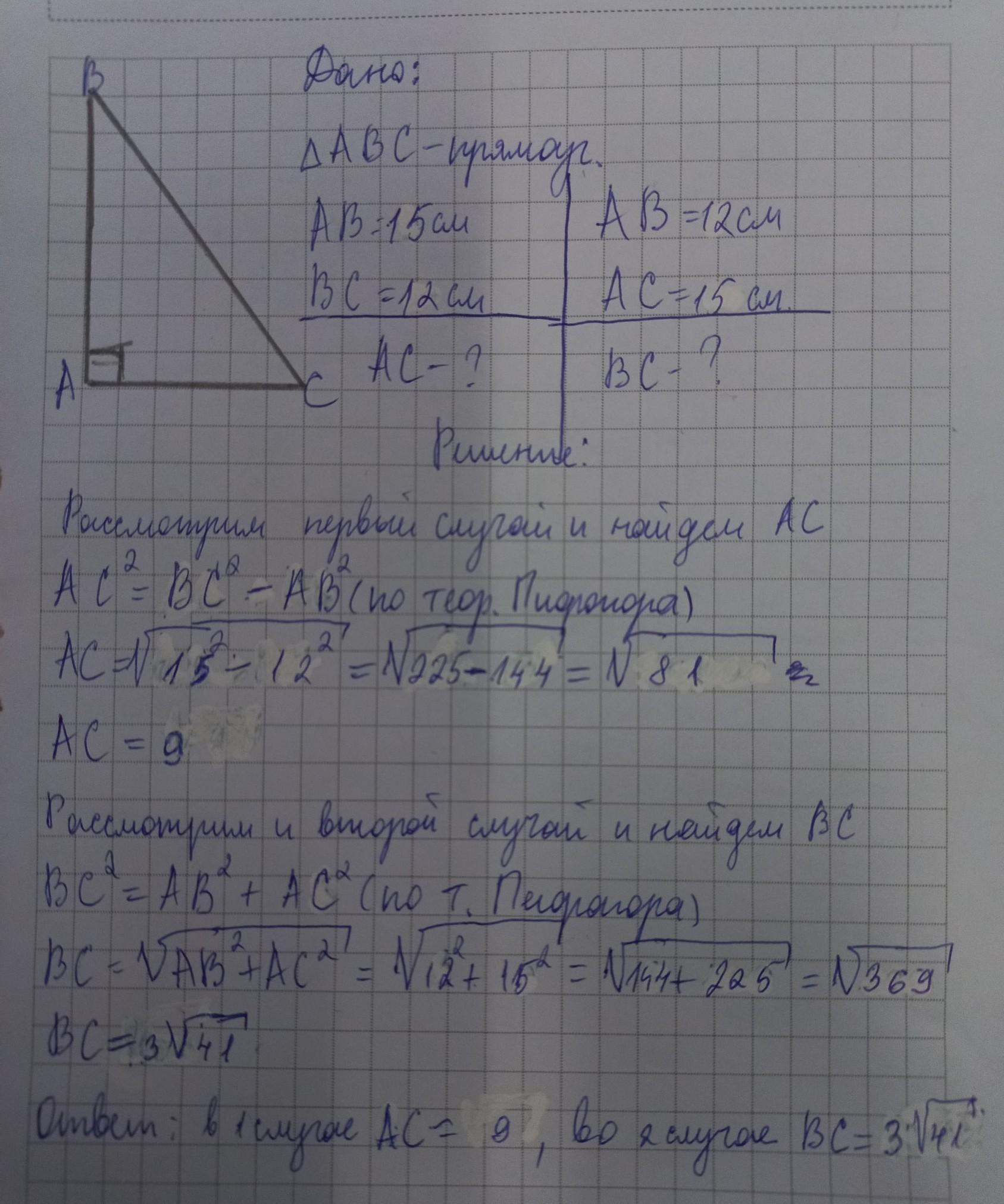2. Стороны прямоугольного треугольника равны 15 см и 12 см. Найдите третью сторону треугольника. Рассмотрите все возможные случаи.