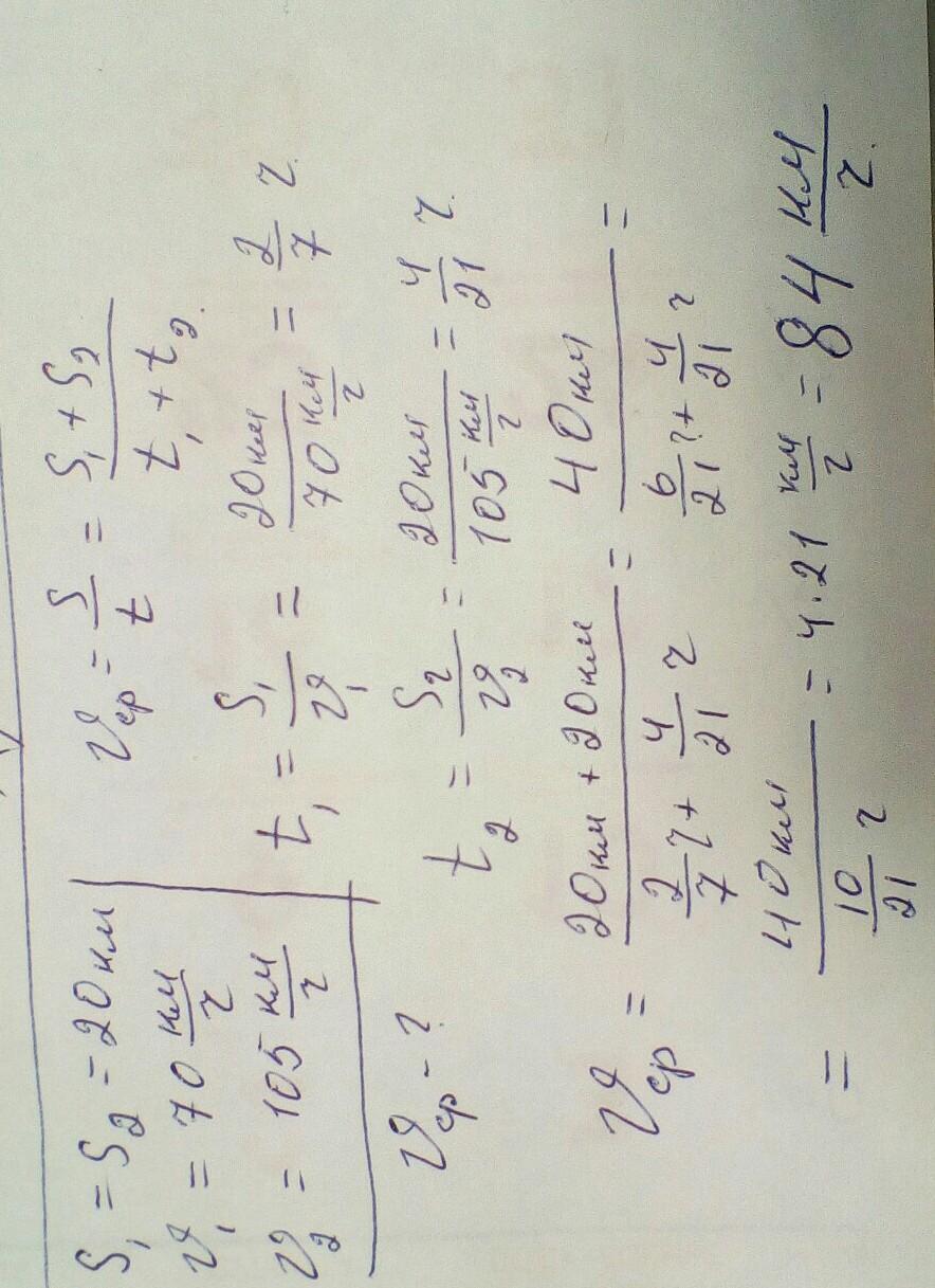 автомобиль 20км проехал со скоростью 70 км.ч. ещё 20 км со скоростью 105км. ч. Чему равна средняя скорость автомобиля на всем пути