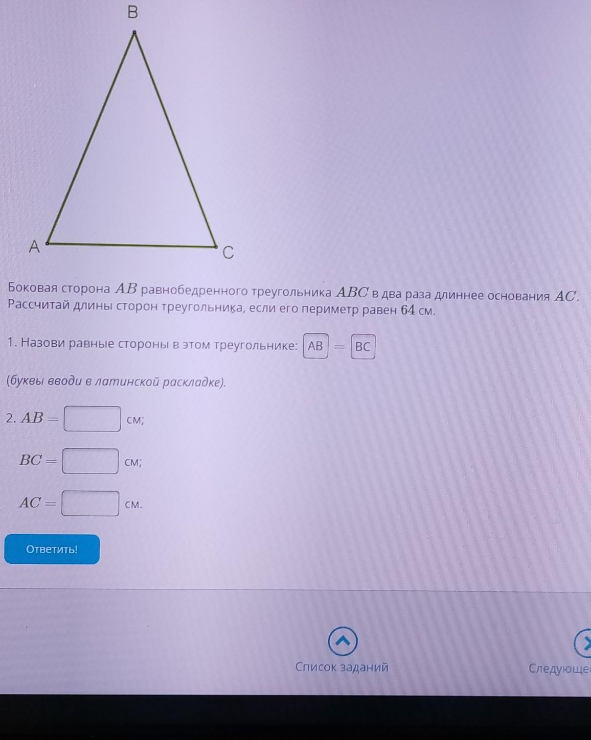 боковая сторона ab равнобедренного треугольника abc в два раза длиннее основания ac рассчитай длины сторон треугольника, если его периметр равен 64 см