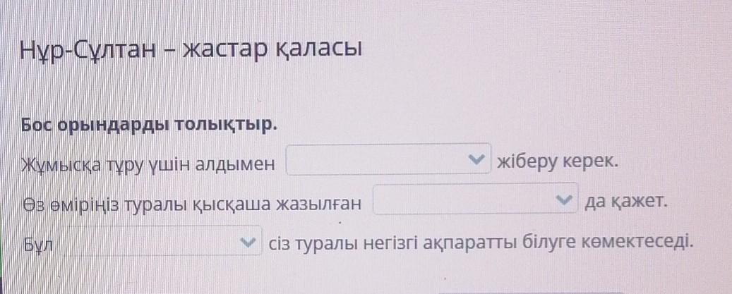Бос орындарды толықтыр. Жұмысқа тұру үшін алдымен У жіберу керек. Өз өміріңіз туралы қысқаша жазылған да қажет. Бұл У сіз туралы негізгі ақпаратты білуге көмектеседі.