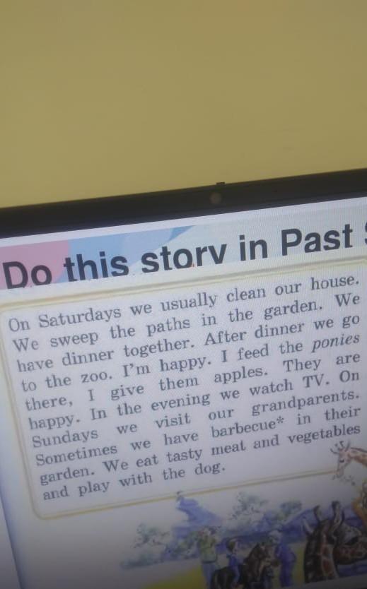 On Saturday we cleaned our house. We swept the paths in the garden. We had dinner together. After dinner we went to the zoo. I was happy. I fed the ponies there. I gave them apples. They were happy. In the evening we watched TV. On Sunday we visited our grandparents. We had barbecue in their garden. We ate tasty meat and vegetables and played with the dog.