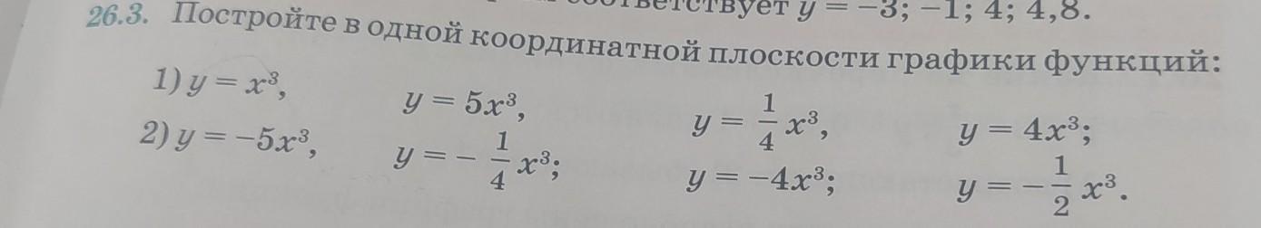 оторым соответствует у 1 26.3. Постройте в одной координатной плоскости графики функций: 1) у хя, y = 5х3, х", 2) у = -53, х3; у = -4х3, у х3 y = 4х3, х 2 - 3. у — у B