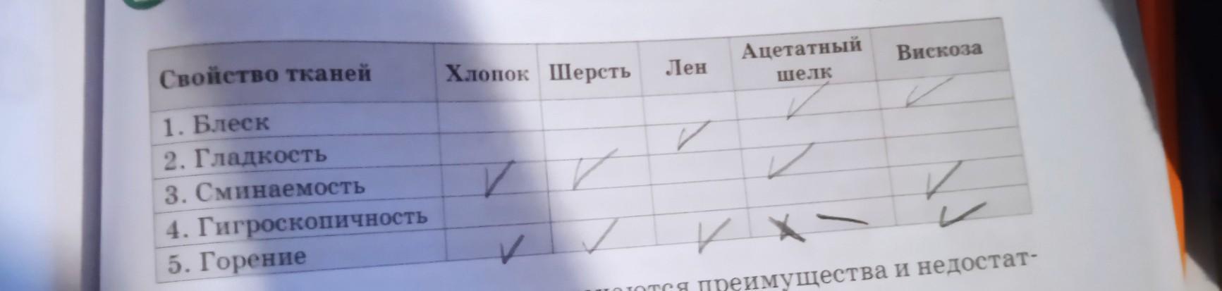 Таблица 12 Свойство тканей Хлопок Шерсть Лен Ацетатный шелк, 1. Блеск Вискоза 2. Гладкость 3. Сминаемость 4. Гигроскопичность 5. Горение помогите у меня 3 мин даю 25бал
