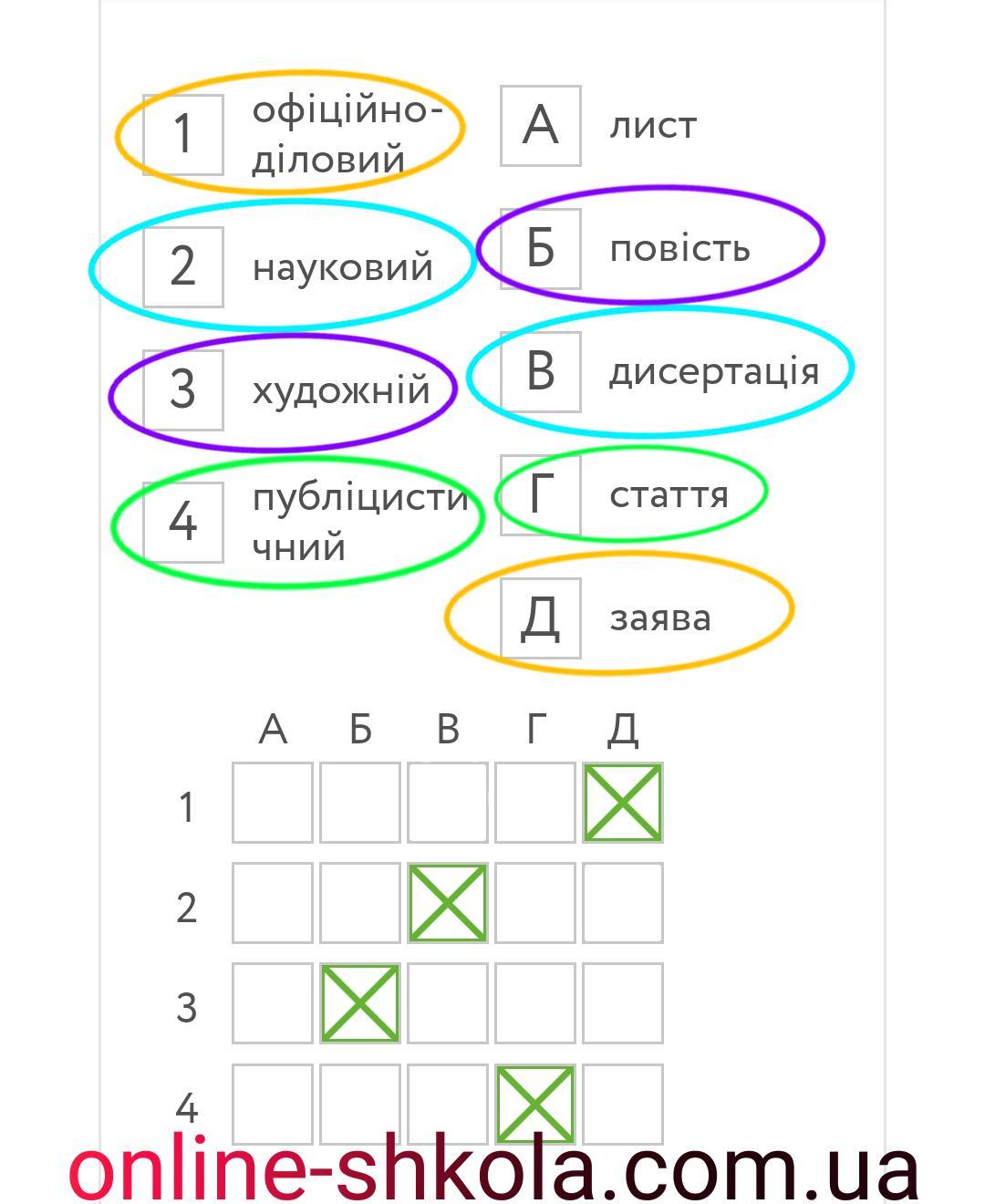 Установіть відповідність між мовним стилем (1-4) та прикладом його вживання (А-Д).