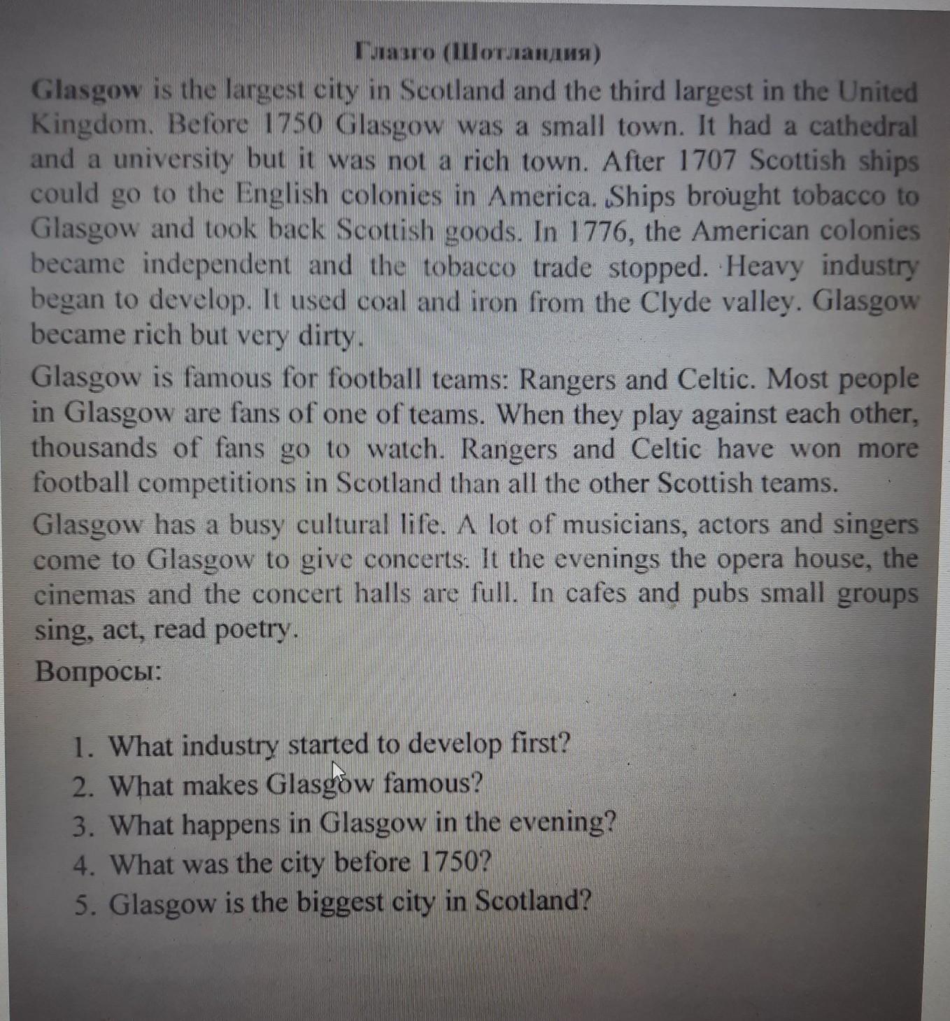Глазго - крупнейший город Шотландии и третий по величине город Соединенного Королевства. До 1750 года Глазго был маленьким городком. В нем были собор и университет, но это был небогатый город. После 1707 года шотландские корабли могли заходить в английские колонии в Америке, корабли привозили табак в Глазго и забирали шотландские товары. В 1776 году американские колонии стали независимыми, и торговля табаком прекратилась. Начала развиваться тяжелая промышленность. Он использовал уголь и железо из долины Клайд. Глазго стал богатым, но очень грязным.