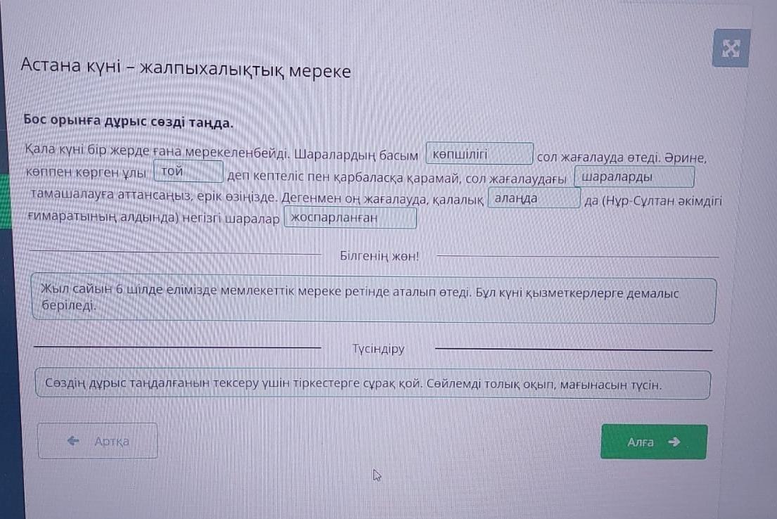 Астана күні – жалпыхалықтық мереке Бос орынға дұрыс сөзді таңда. Қала күні бір жерде ғана мерекеленбейді. Шаралардың басым сол жағалауда өтеді. Әрине, көппен көрген ұлы деп кептеліс пен қарбаласқа қарамай, сол жағалаудағы тамашалауға аттансаңыз, ерік өзіңізде. Дегенмен оң жағалауда, қалалық да (Нұр-Сұлтан әкімдігі ғимаратының алдында) негізгі шаралар Артқа Тексеру СРОЧНО 20 БАЛОВ МОЖЕТЕ ДАТЬ НА ОТВЕТ НА ВСЕ ВОПРОСЫ ОНЛАЙН МЕКТЕП