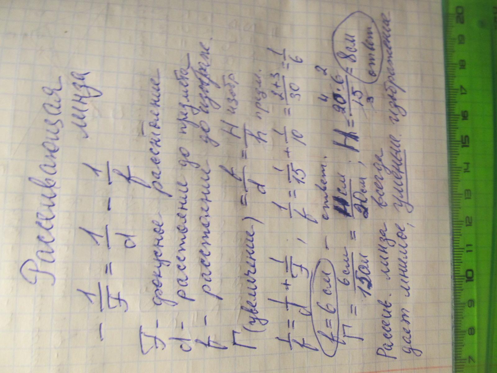 Відстань від предмета висотою 20 см до розсіювальної лінзи дорівнює 15 см .Фокусна відстань лінзи 10 см . Визначити відстань від лінзи до зображення і висоту зображення. (ст..5 i