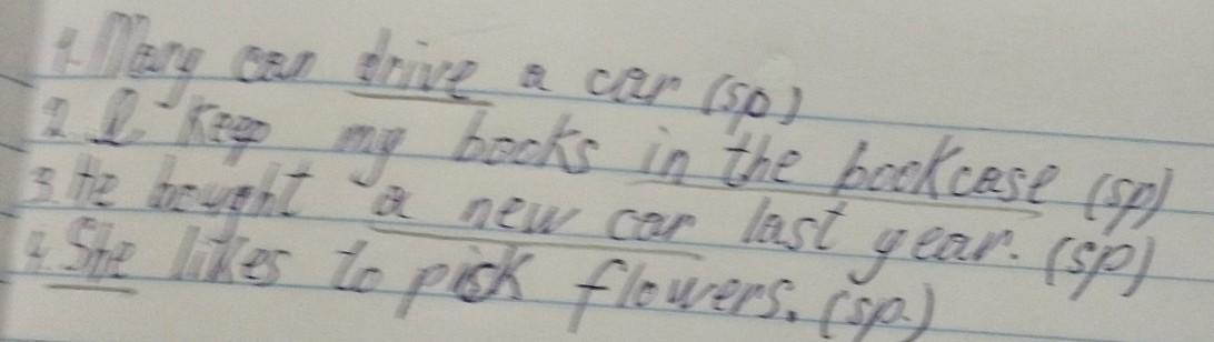 1. Mary can can drive a car (sp) 2 l keep my books in the bookcase (5) 3. He bought a new car last year. (sp) į She likes to pick flowers. (sp.)