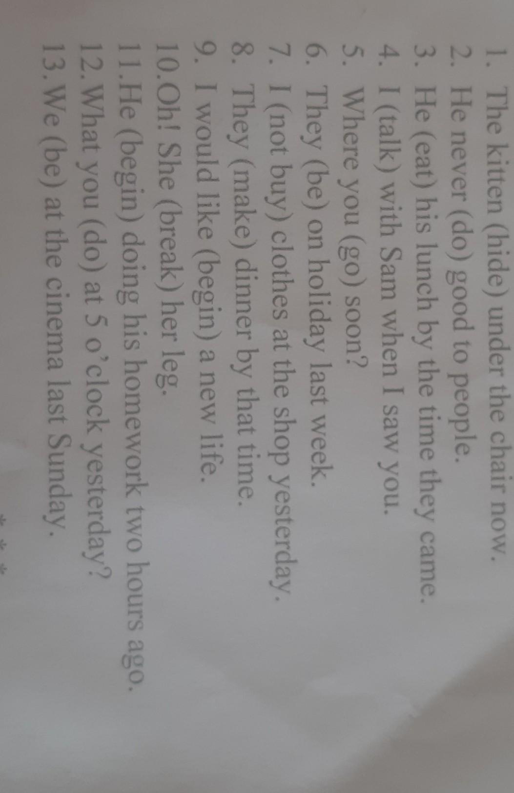 1. is hiding, 2. has never done, 3. had eaten, 4. was talking, 5. are you going, 6. were, 7. didn't buy, 8. had made, 9. to begin, 10. broke, 11. began, 12. were you doing, 13. were