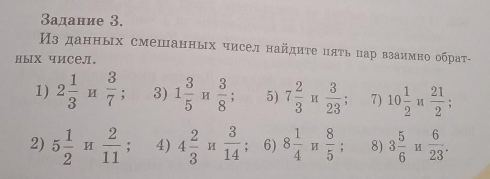 Задание 3. Из данных смешанных чисел найдите пять пар взаимно обрат- ных чисел. 1 3 3 3 1) 2 3 и 1 3) 1 21 5) и : 7) 10 — и 8 23 2 2 : 5) 7 as a sim 1 2) 5 2. 3 1 5 5 2 И 11 3 4) 41 6) 8 6 и 23 и 5 14 8) 3 6 3 4СРОЧНООООООО ДАМ 15 БАЛЛОВ