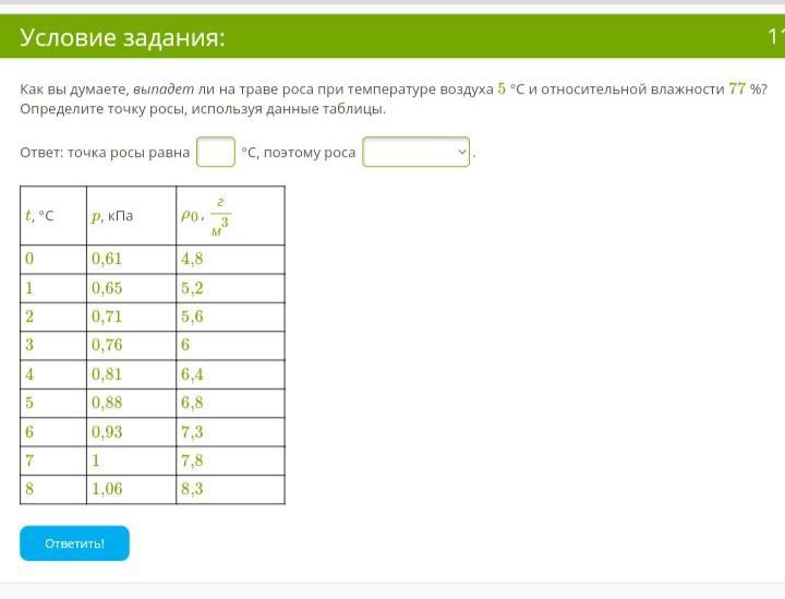 Как вы думаете, выпадет ли на траве роса при температуре воздуха 5 °С и относительной влажности 77 %? Определите точку росы, используя данные таблицы. Ответ: точка росы равна °С, поэтому роса . t, °С p, кПа ρ0, гм3 0 0,61 4,8 1 0,65 5,2 2 0,71 5,6 3 0,76 6 4 0,81 6,4 5 0,88 6,8 6 0,93 7,3 7 1 7,8 8 1,06 8,3