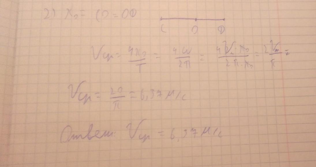 Тело совершает гармонические колебания вдоль прямой между точками С и Д (см. рис.). Зная, что максимальная скорость точки Vмах = 10 м/с, найти среднюю скорость Vcp при движении от точки С до точки Д.