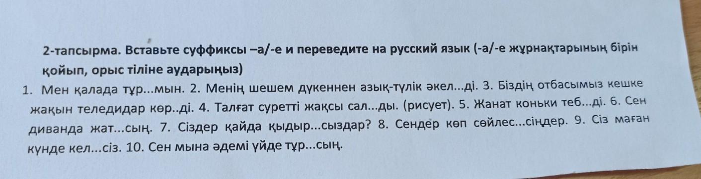 2-тапсырма. Вставьте суффиксы -а/-е и переведите на русский язык (-а/-е жұрнақтарының бірін қойып, орыс тіліне аударыңыз) 1. Мен қалада тұр...мын. 2. Менің шешем дүкеннен азық-түлік әкел...ді. 3. Біздің отбасымыз кешке жақын теледидар көр..ді. 4. Талғат суретті жақсы сал...ды. (рисует). 5. Жанат коньки теб...ді. 6. Сен диванда жат...сың. 7. Сіздер қайда қыдыр...сыздар? 8. Сендер көп сөйлес...сіңдер. 9. Сіз маған күнде кел...сіз. 10. Сен мына әдемі үйде тұр...сың.