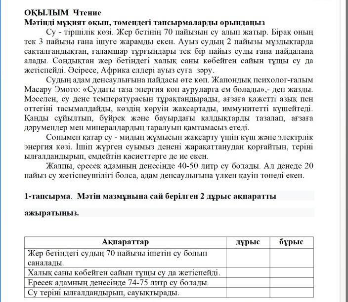 ОҚЫЛЫМ Чтение Мәтінді мұқият оқып, томендегі тапсырмаларды орындаңыз Су – тіршілік көзі. Жер бетінің 70 пайызын су алып жатыр. Бірақ оның тек 3 пайызы ғана ігуге жарамды екен. Ауыз судың 2 пайызы мұздықтарда сақталғандықтан, галамшар тұрғындары тек бір пайыз суды гана пайдалана алады. Сондықтан жер бетіндегі халық саны көбейген сайын тұщы су да жетіспейді. Әсіресе, Африка елдері ауыз суға зәру. Судың адам денсаулығына пайдасы өте көп. Жапондық психолог-ғалым Масару Эмото: «Судагы таза энергия көп ауруларға ем болады»,- деп жазды. Мәселен, су дене температурасын тұрақтандырады, ағзаға қажетті азық пен оттегіні тасымалдайды, көздің көруін жақсартады, иммунитетті күшейтеді. Қанды сұйылтып, бүйрек және бауырдағы қалдықтарды тазалап, ағзаға дәрумендер мен минералдардың таралуын қамтамасыз етеді. Сонымен қатар су - мидың жұмысын жақсарту үшін күш және электрлік энергия көзі. Ішіп жүрген суымыз денені жарақаттанудан қорғайтын, теріні ылғалдандырып, емдейтін қасиеттерге де ие екен. Жалпы, ересек адамның денесінде 40-50 литр су болады. Ал денеде 20 пайыз су жетіспеушілігі болса, адам денсаулығына үлкен қауіп төнеді екен. 1-тапсырма. Мәтін мазмұнына сай берілген 2 дұрыс ақпаратты ажыратыңыз. дұрыс бұрыс Ақпараттар Жер бетіндегі судың 70 пайызы ішетін су болып саналады. Халық саны көбейген сайын тұщы су да жетіспейді. Ересек адамның денесінде 74-75 литр су болады. Су теріні ылғалдандырып, сауықтырады,