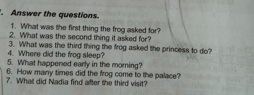 1. Answer the questions. 1. What was the first thing the frog asked for? 2. What was the second thing I asked for? 3. What was the third thing the frog asked the princess to do? 4. Where did the frog sleep? 5. What happened early in the morning? 6. How many times did the frog come to the palace? 7. What did Nadia find after the third visit?