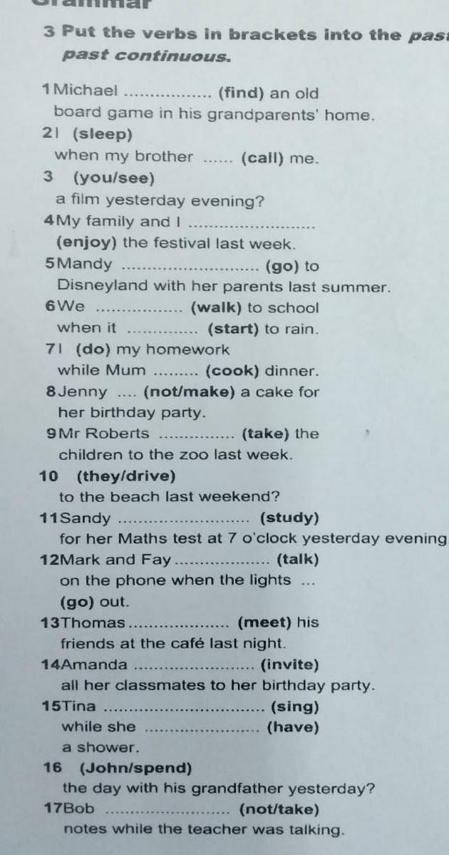 1. found; 2 . was sleeping; called; 3. Did you see; 4. enjoyed; 5. went; 6. were walking; started; 7. was doing; was cooking; 8. did not make; 9. took; 10 .Did they drive; 11. was studying; 12. went; 13. met; 14. invited; 15. was singing; was having; 16. Did John spend; 17. was not taking; was talking