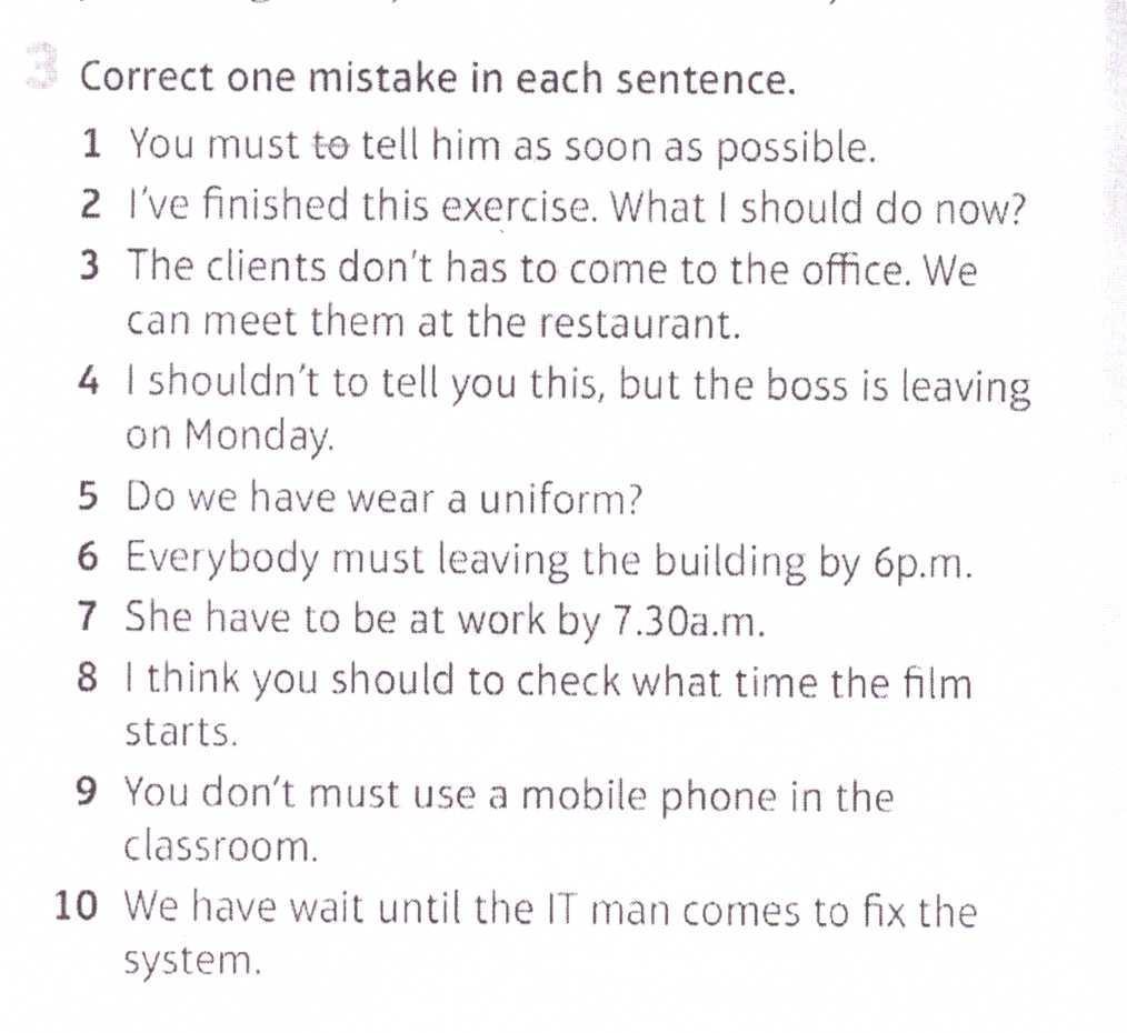 6 Everyone has to be out of the building by 6pm. 7 She has to be at work by 7:30 in the morning.