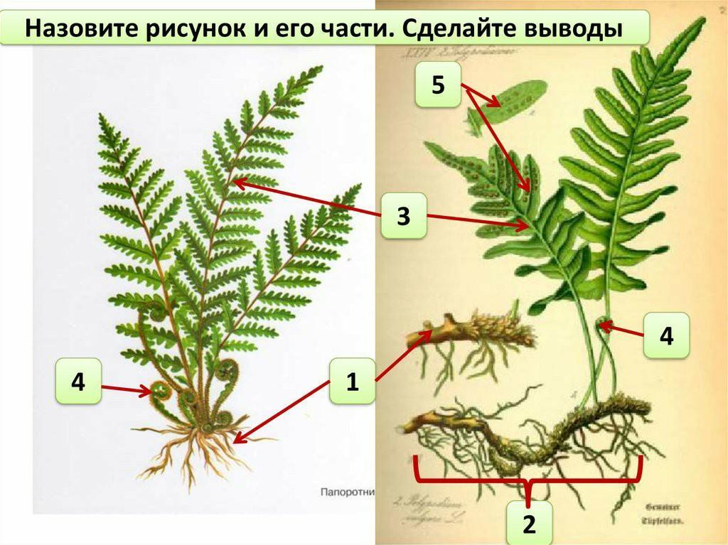 Вывод: Папоротники имеют стебель, листья, корни. В стебле есть сосудистые пучки. Наличие проводящей ткани дает папоротнику больше преимуществ в выживании, чем мхам, поскольку всасываемая корнями из почвы вода по сосудам стебля передвигается в листья. Это результат приспособленности папоротников к наземному образу жизни.