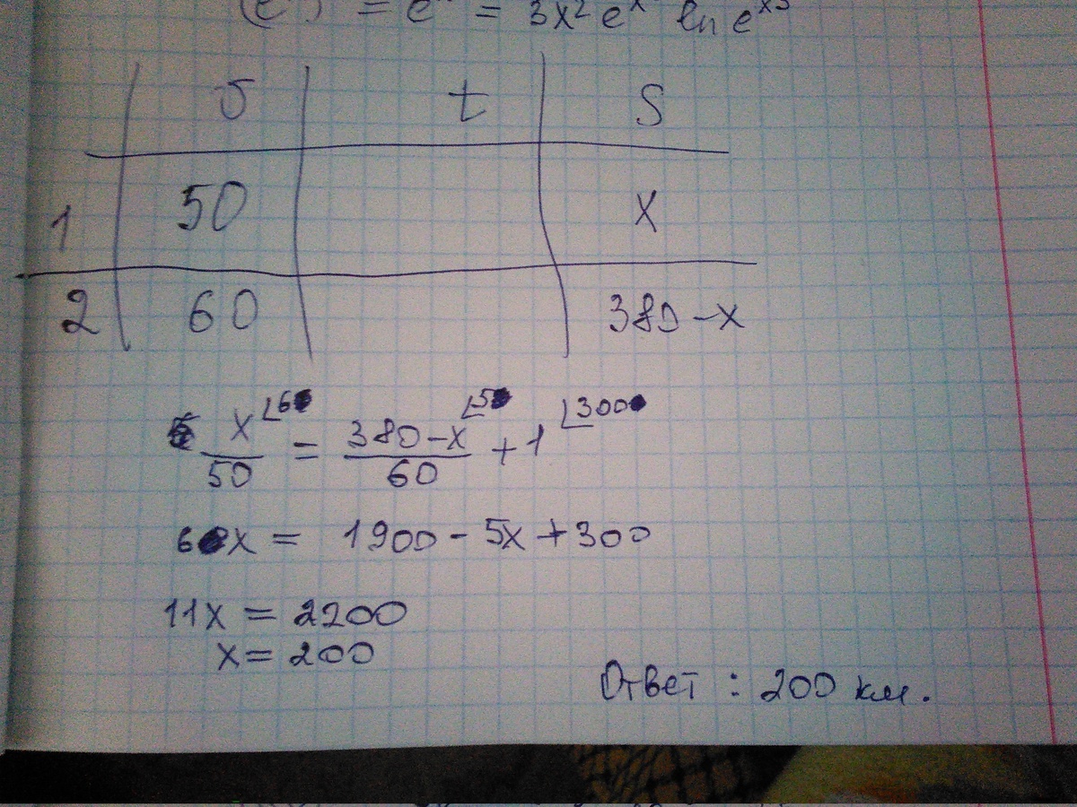 Расстояние между городами A и B равно 380 км. Из города A в город B со скоростью 50 км/ч выехал первый автомобиль, а через час после этого навстречу ему из города B выехал со скоростью 60 км/ч второй автомобиль. На каком расстоянии от города A автомобили встретятся Ответ дайте в километрах.